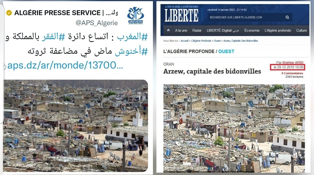 سليمان أعراج شارك بصفته مستشارا اعلاميا لرئيسه تبون؛ وما هي؛ إلا أياما ؛ تعد على رؤوس الأصابع؛ حتى نشرت وكالة الانباء العسكرية الجزائرية؛ خبرا زائفا حول حي صفيحي بالجزائر؛ والذي كان موضوع سبق أن نشرته الصحافة الجزائرية نفسها؛ نسب إلى المغرب بدون حشمة؛ ولا حياء كما يتبين من الصورة ؛ مما يؤكد صحة كل ما ننشر على دولة الدجالين ” الجزائر” مشفوع بحجج؛ وقرائن؛ ويكذب تصريحاتهم؛ وشعاراتهم؛ رغم تعاطف البعض معهم؛ الا ان لنا سؤال؛ هل مثل هؤلاء يشرفون تمثيل الإعلام العربي بليبيا؛ ام غيرها؟.