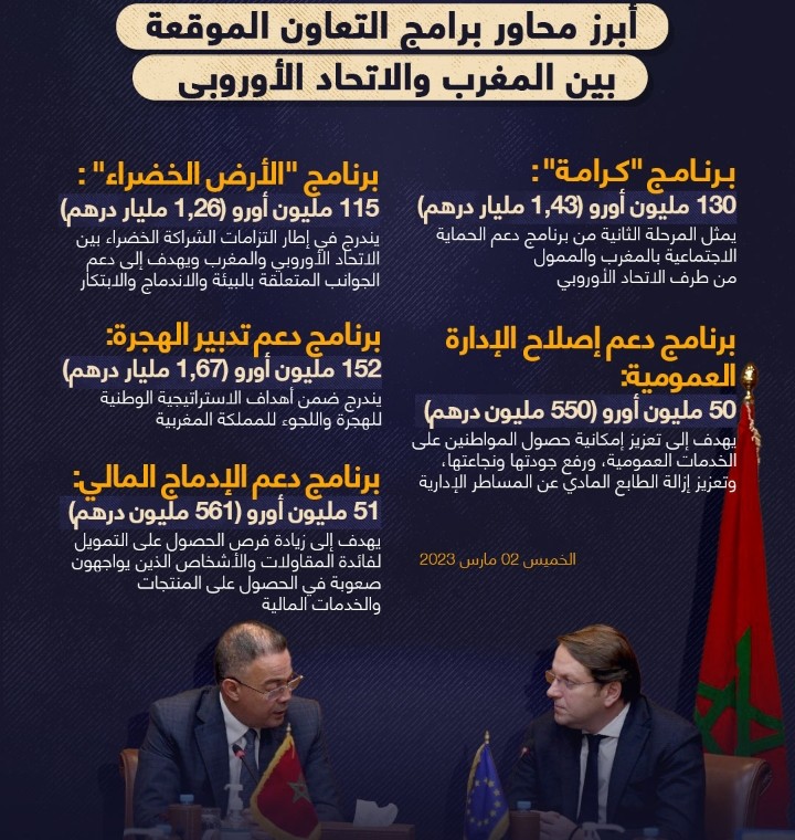 وتهم برامج التعاون الخمسة ، التي وقعها الوزير المنتدب لدى وزيرة الاقتصاد والمالية المكلف بالميزانية، فوزي لقجع، والمفوض الأوروبي المكلف بسياسة الجوار والتوسع، أوليفر فاريلي، دعم الحماية الاجتماعية، ودعم التحول الأخضر، ودعم إصلاح الإدارة العمومية، ودعم تدبير الهجرة، وتعزيز الإدماج المالي.