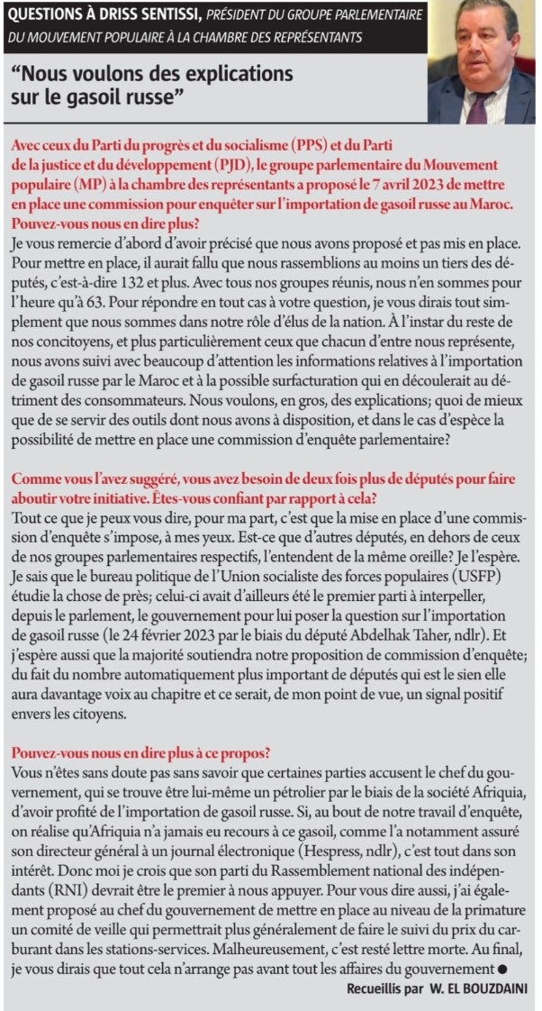 اجرت جريدة تصدر بالبيضاء ناطقة باللغة الفرنسية؛ لقاءا صحافيا؛ استضافت فيه السيد إدريس السنتيسي رئيس فريق الحركة الشعبية (معارضة) ؛ بمجلس النواب؛ حول طلب احداث لجنة تقصي الحقائق في موضوع المحروقات المستوردة من روسيا الذي تقدمت به ثلاث فرق برلمانية العدالة والتنمية؛ والتقدم والاشتراكية؛ والحركة الشعبية.