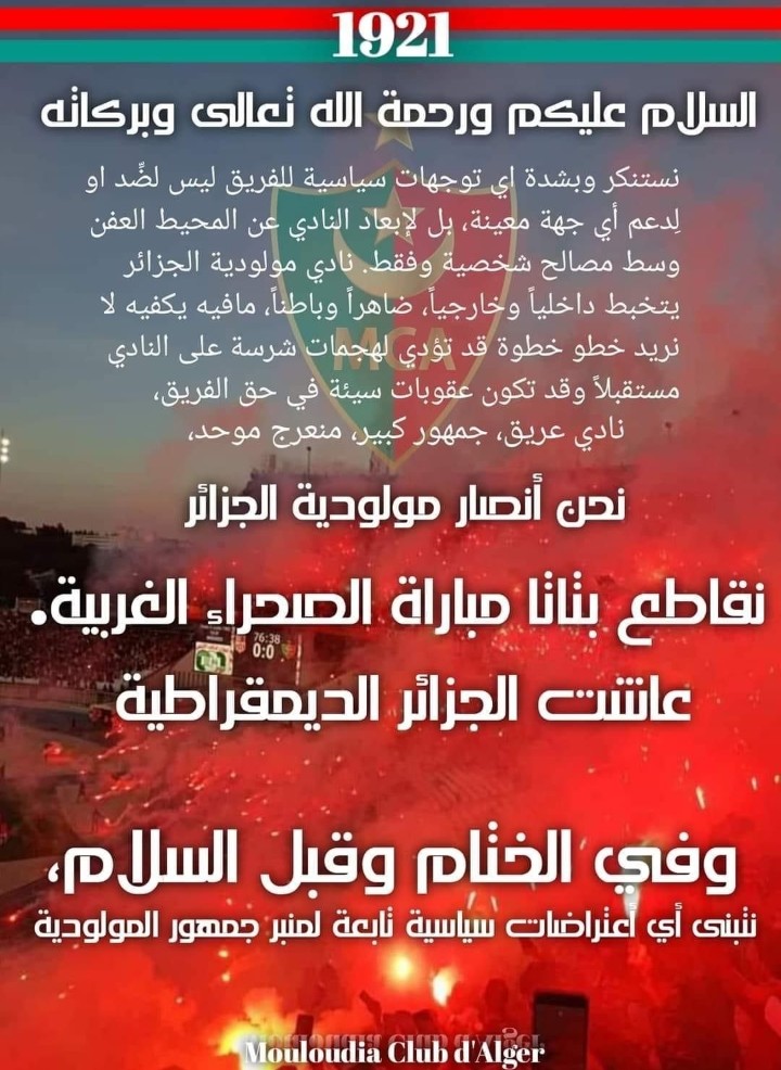 أصدر أنصار مولودية الجزائر بلاغا ضد المكتب المسير المرتزق سارق تاريخ فريقهم مثلما ثم سرقة أرض القبايليين.