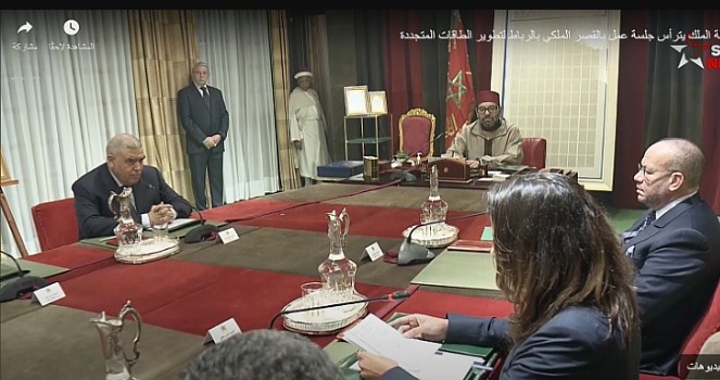 ملحوظة : في الصورة اجتماع جلالة الملك مع مستشاري جلالته ومسؤولين حكوميين حول موضوع الطاقات المتجددة