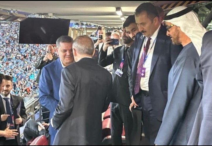 في المعادلة الرياضية فريقين يتنافسان؛ في المعادلة الديبلوماسية ” احضي راسك”؛ مع من وضد من؛ خاصة لما يجتمع في لقاء كروي رئيسين تجمعهما كلمة الوحدة العربية…فخامة رئيس دولة الإمارات العربية المتحدة؛ وفخامة رئيس الحكومة التركية؛ وفخامة رئيس الحكومة التركية عبد الحميد الدبيبة؛ وهي رسالة الربح لا الخسارة .
