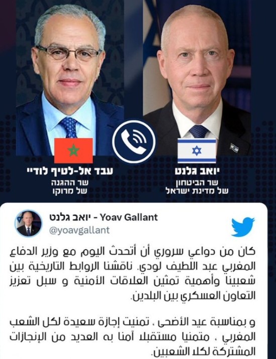 وزير الدفاع الاسرائيلي يتمنى للشعب المغرب اجازة سعيدة بمناسبة عيد الأضحى في اتصال هاتفي مع نظيره المغربي السيد لوديي
