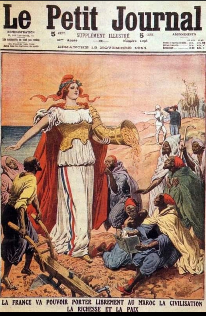 Le petit journal du france ;كما تلاحظون في الصورة؛ أشار في احدى مقالاته قبل ما يزيد عن قرن واكثر ان فرنسا ستجلب لنا الحرية والحضارة؛ والثروة؛ والسلام.